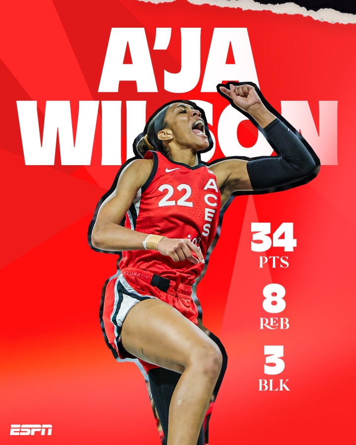 此役,阿德巴约女友、WNBA超级巨星、王牌队中锋阿贾-威尔逊再显神威,她登场30分29秒16投11中,三分1中1、罚球14中11(飞翼全队罚球9中8),狂砍34分8篮板1助攻2抢断3盖帽。